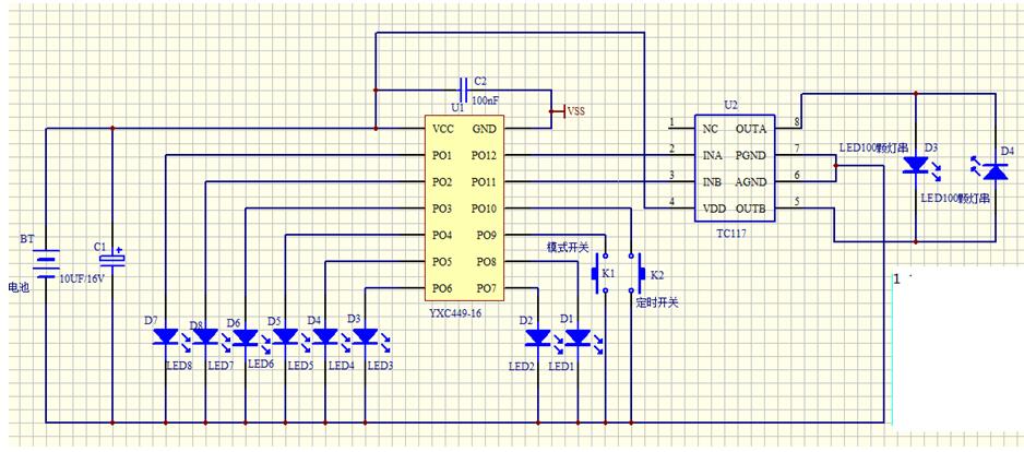 8路模式指示灯,上电不工作。有两个按键分别控制输出模式和定时模式,K2是定时按键,按