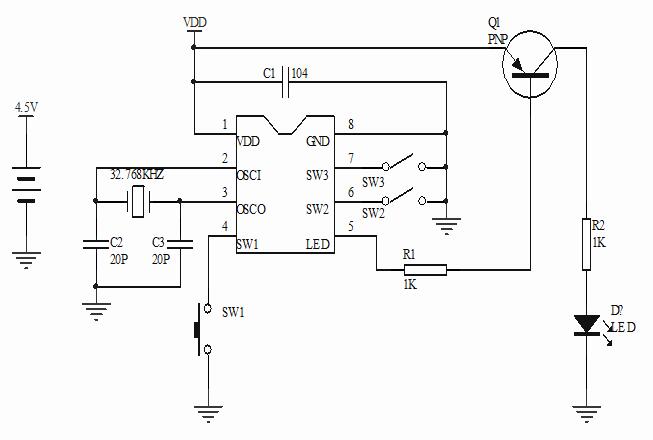 当 SW2 断开时,定时IC上电工作,进入当前定时模式,两种定时时间由 SW3 选择,当 SW3
