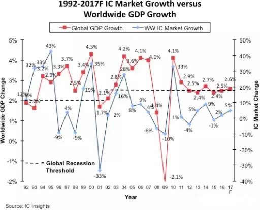 IC Insights在2017年版的麦克莱恩报告中指出,自2010年以来,全球经济增长一直是集成电路产业增长的主要影响因素。在这个“全球经济驱动”的IC产业中,利率,油价和财政刺激等因素是IC市场增长的主要驱动因素。这与2010年之前有很大不同,当时资本支出,IC产业能力和IC定价特征推动了IC产业周期。