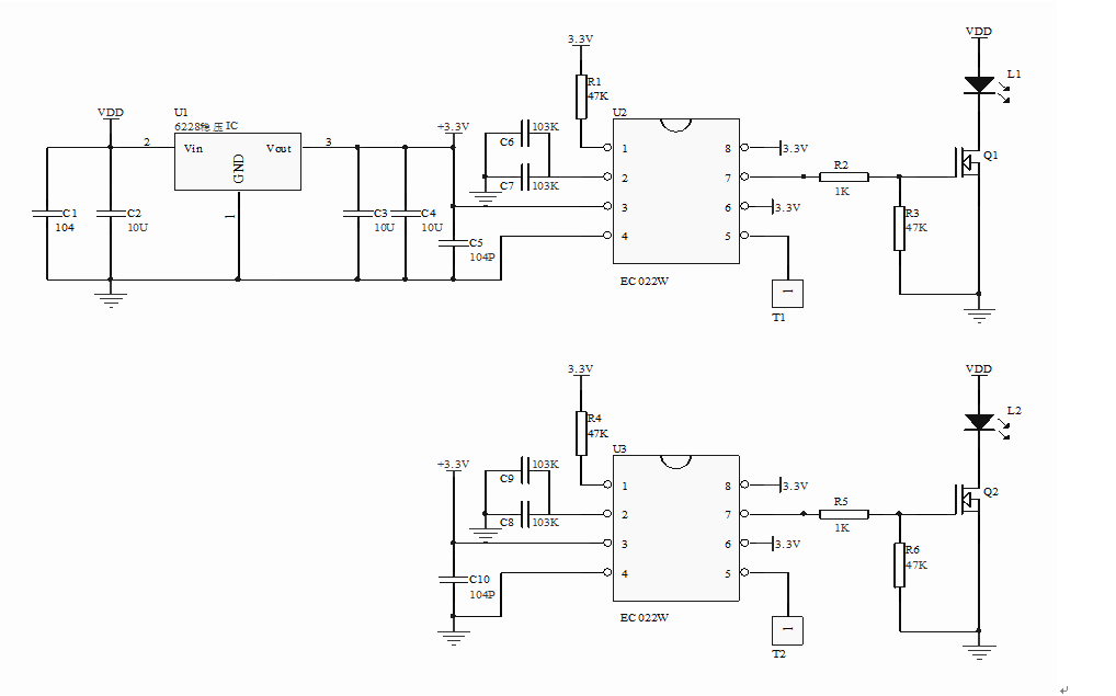 三、上电不工作,触摸按键K1打开LED1亮,初始亮度默认 50%。工作时长按无极调光,一次长按增加亮度,一次长按减小亮度,短按关。触摸按键K2功能和K1相同。