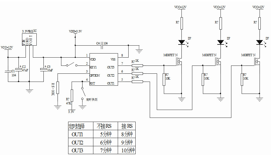 二、当KEY1开关脚一直接VDD,上电可工作;(以选择定时5分钟为例)则定时工作5分钟后停止,如果定时过程中高电位消失,则输出马上停止,重新加上高电位则重新计时5分钟, 输出为高电平。