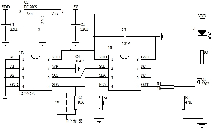 芯片供电电压:DC2.4-5V。一路轻触开关输入控制,一路LED输出。