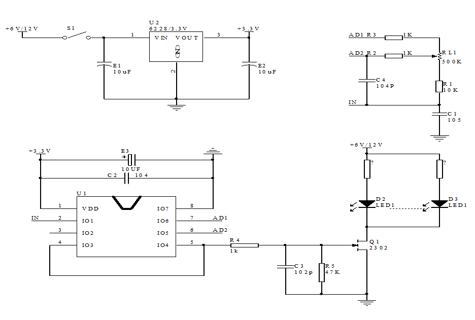顺时针旋动电位器时,灯光亮度逐渐增加,逆时针旋动电位器时,灯光亮度会逐渐降低。LED灯光最高亮度是100%,最低亮度是5%。输出灯串做两种,6V灯串和12V灯串,要求PCB共用。6v时,灯串电流1A,12V时电流500MA。输出无频闪。