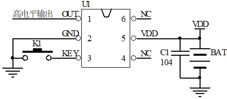 工作电压:DC 2.4-5.0V, 按键轻触开关KEY,控制一路OUT输出,上电不工作OUT输出低电平,长按按键 5秒开机,OUT输出高电平。工作中长按按键 5秒关机,OUT输出是低电平。